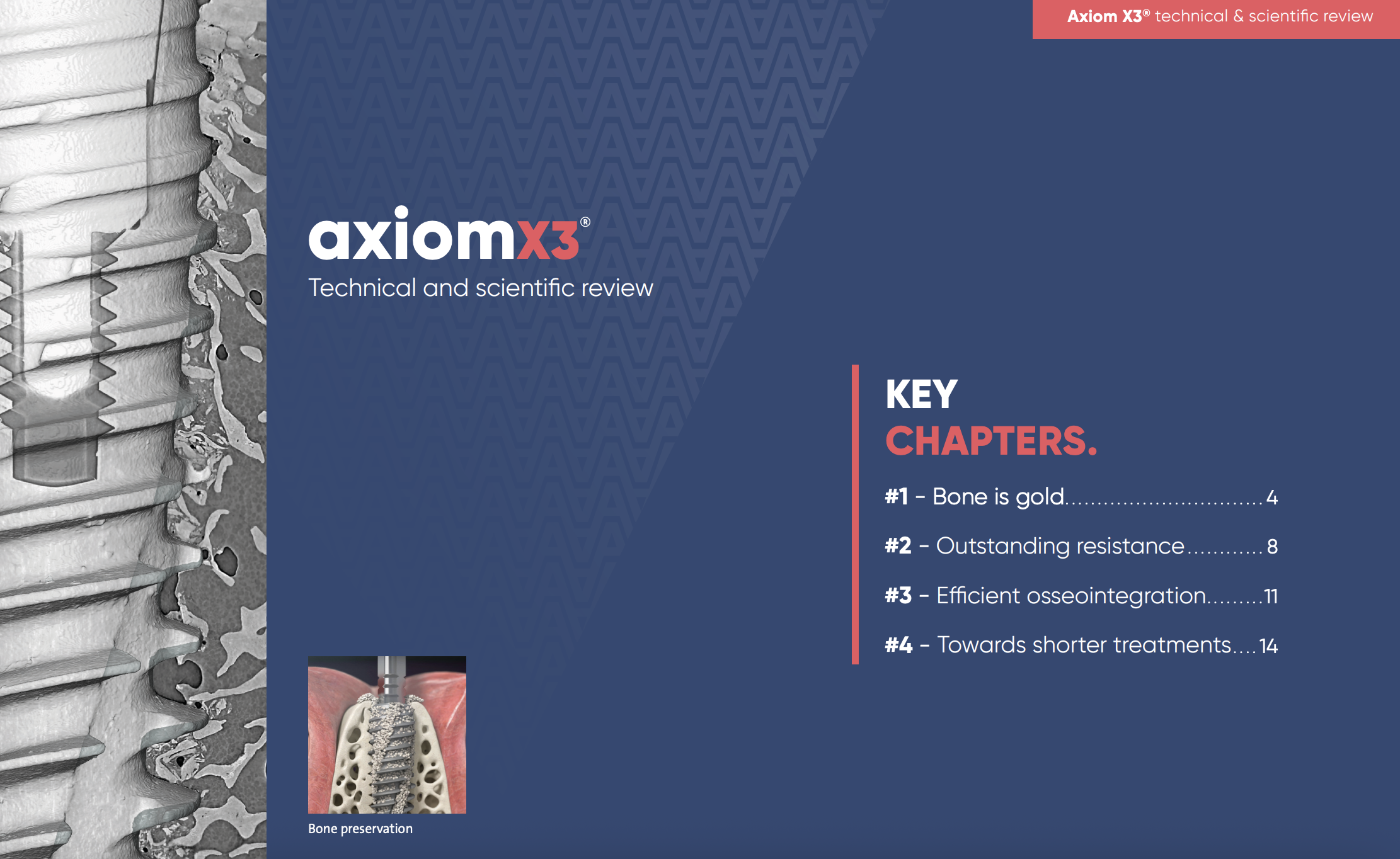 Implant Axiom X3 posiada trzy specjalne rowki tnące rozmieszczone na jego powierzchni. Ich zadaniem jest dynamiczne prowadzenie implantu podczas wprowadzania oraz poprawa jego stabilizacji na całej długości. Rowki te umożliwiają również korektę osi w trakcie insercji, co ułatwia precyzyjne ustawienie implantu w zaplanowanej pozycji.