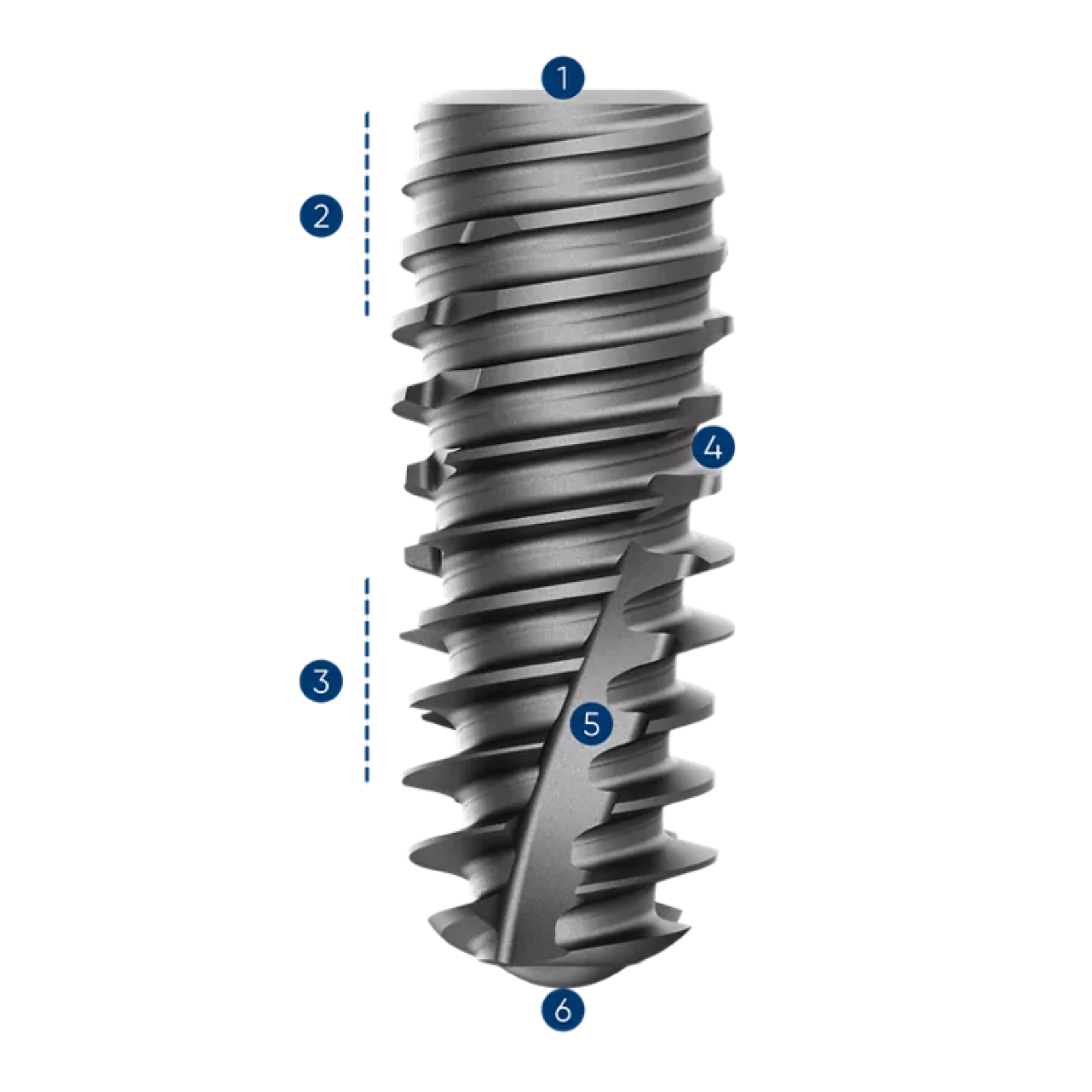 Jedną z kluczowych cech konstrukcyjnych implantu jest stożkowy profil, który sprzyja kondensacji kości i zwiększa stabilność pierwotną, szczególnie w kości o niskiej gęstości. Implant posiada także smukłe gwinty o naprzemiennej głębokości, co umożliwia łatwiejszą insercję i redukuje naprężenia w kości o wysokiej gęstości. Dodatkowo zastosowano trzy dwukierunkowe rowki tnące, które prowadzą implant podczas wprowadzania, poprawiają kontrolę osi insercji i wspierają dynamiczne zakotwiczenie na całej długości implantu.